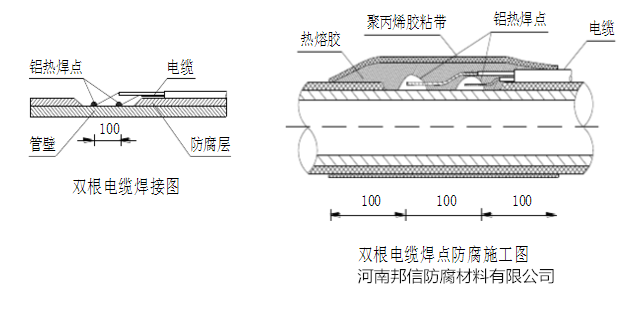⑦電纜與管道連接、電纜與帶狀陽極的連接均采用鋁熱焊,應(yīng)對連接處的防腐進行檢查。